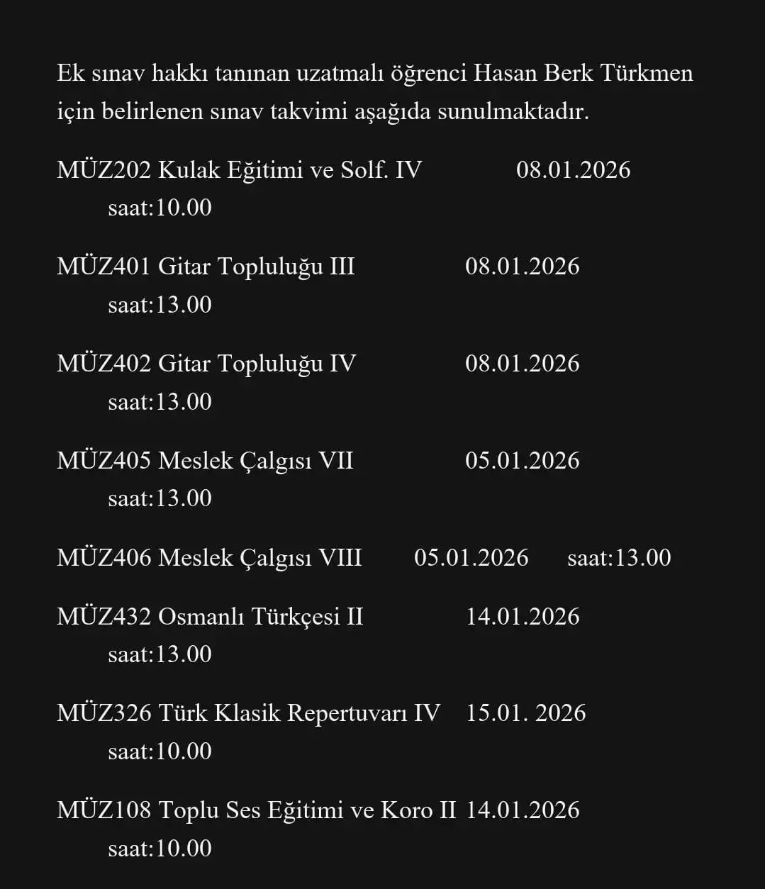 "Hasan Berk Türkmen" İçin Belirlenen Sınav Takvimi