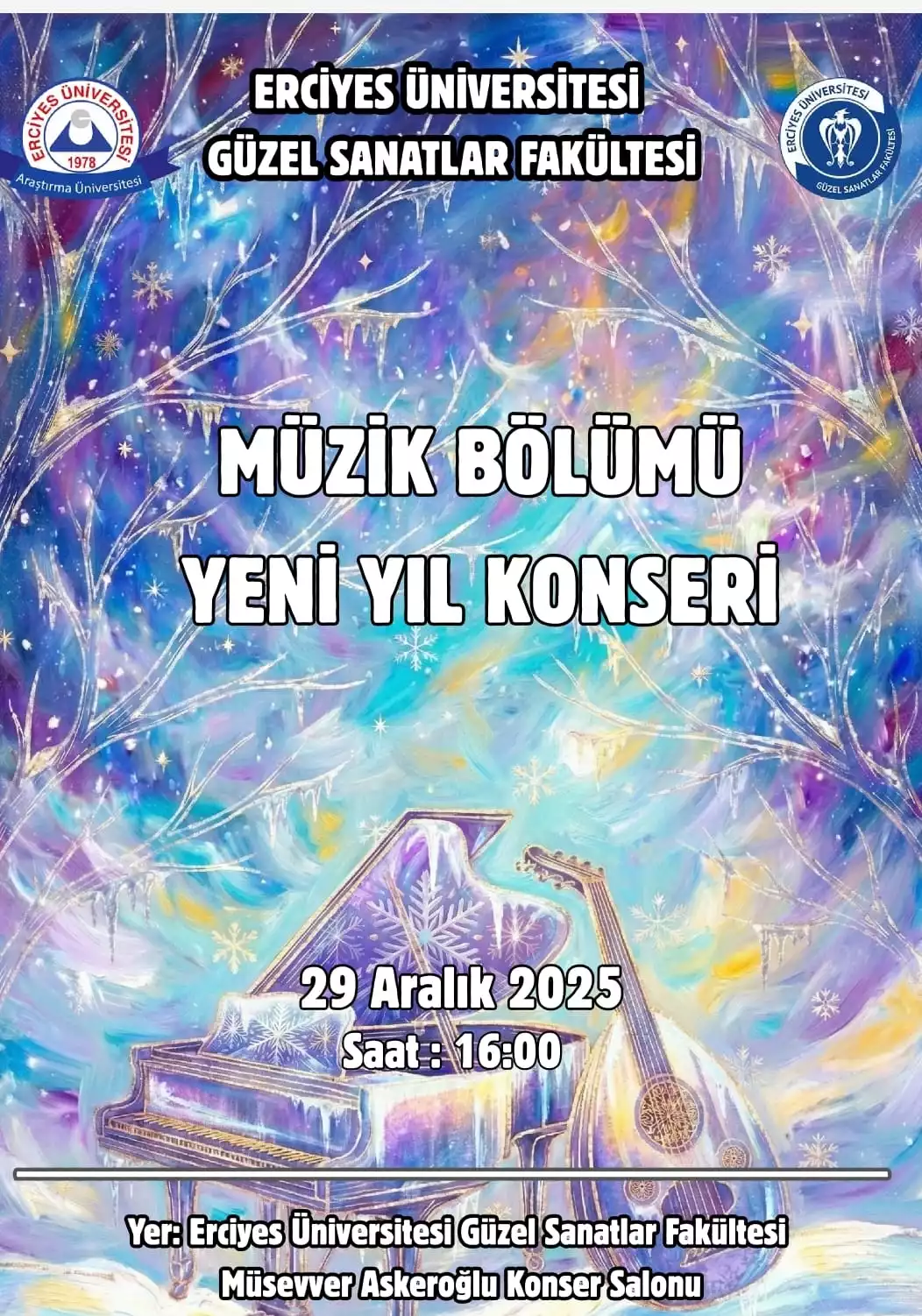 Erciyes Üniversitesi Güzel Sanatlar Fakültesi Müzik Bölümü tarafından düzenlenen Yeni Yıl Konseri, 29 Aralık 2025 Pazartesi günü saat 16.00’da Müsevver Askeroğlu Konser Salonu’nda gerçekleştirilecektir. Akademisyenlerimizin ve öğrencilerimizin sahne alacağı bu özel konsere katılımlarınızı bekleriz.